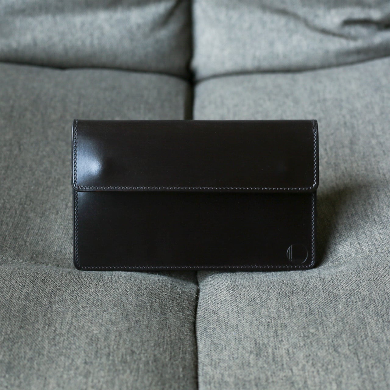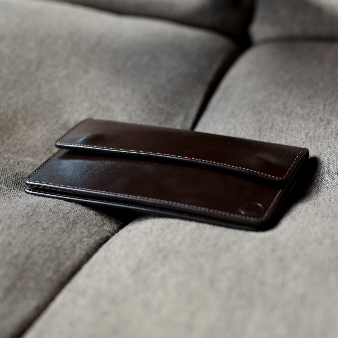 ブライドルレザーは使い始めは非常に硬く、馴染むまで時間がかかる革です。画像は3カ月程度使用したものになります。全体的にツヤが増し、スナップボタンのアタリが出て、より薄くスマートな印象に。