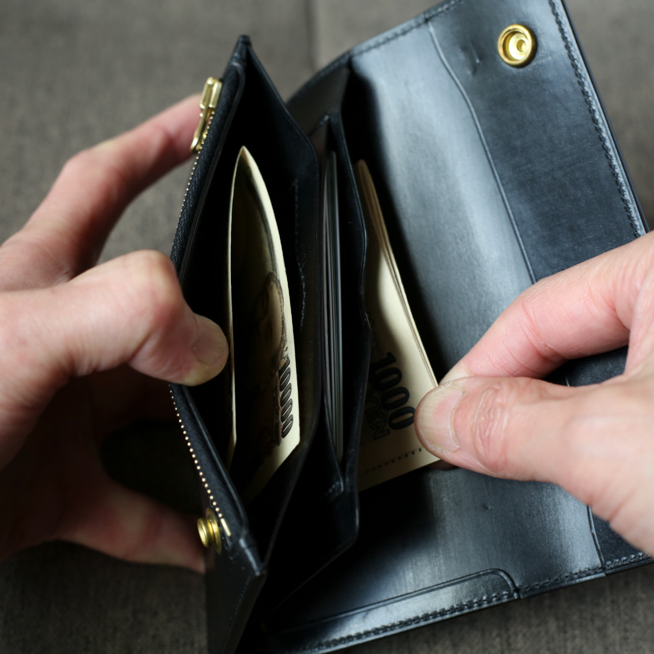 ミドルトラッカーウォレットの最大の弱点である札の出し入れのしにくさを解消するために最背面の札入れはスリット式にしています。コンパクトながらもお札にアクセスしやすく、ストレスを感じません。