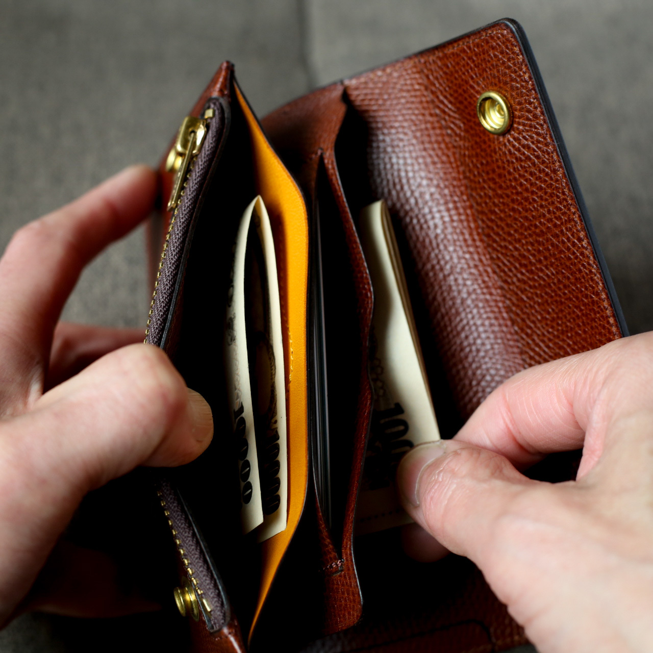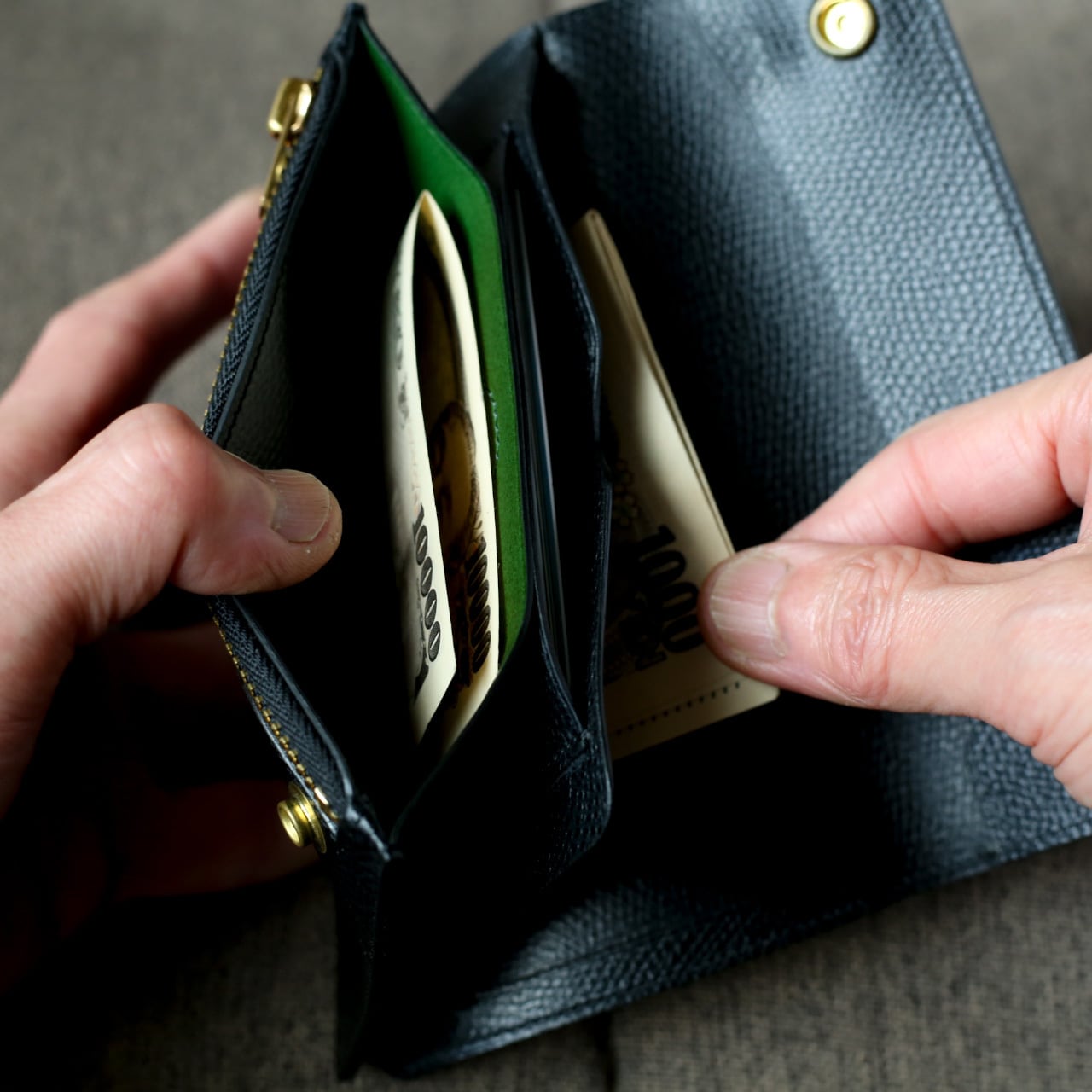 ミドルトラッカーウォレットの最大の弱点である札の出し入れのしにくさを解消するために最背面の札入れはスリット式にしています。コンパクトながらもお札にアクセスしやすく、ストレスを感じません。