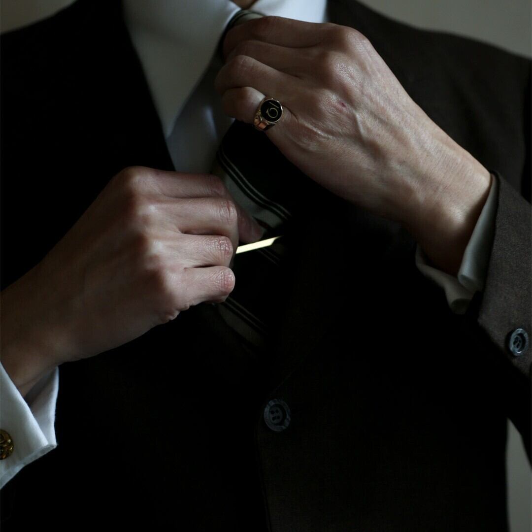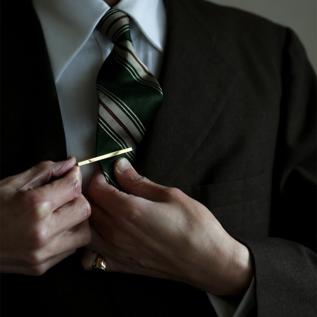また、ナロータイのような細身のネクタイには斜めに挿すなどしてスタイルの変化も楽しめます。