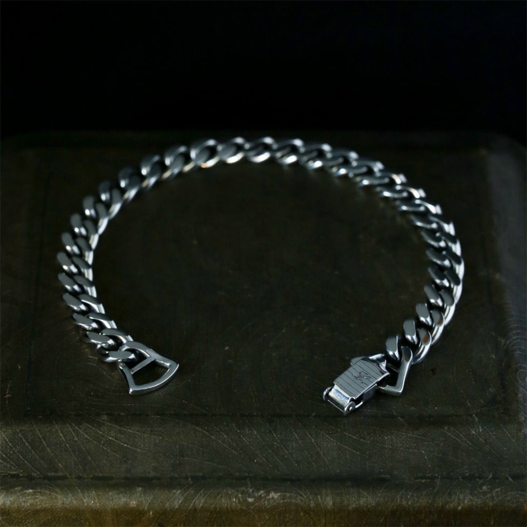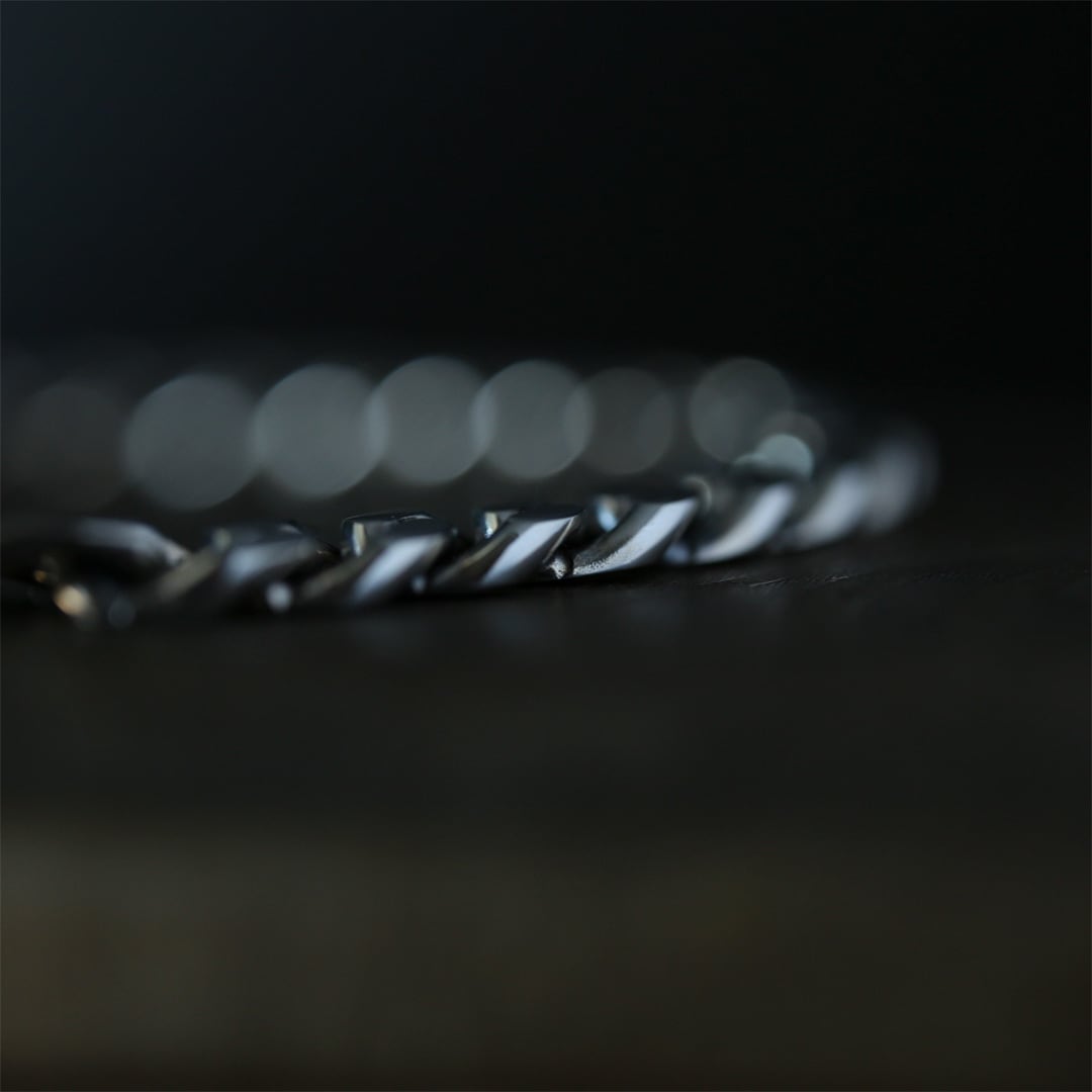 チェーンはシンプルな喜平ですが、面取りを深くすることでフラットな印象に仕上げています。デザインはチェーンの魅力を活かすデザイン。余計なものは省きました。主張しすぎず、いつでも着けていたくなるようなブレスレットです。