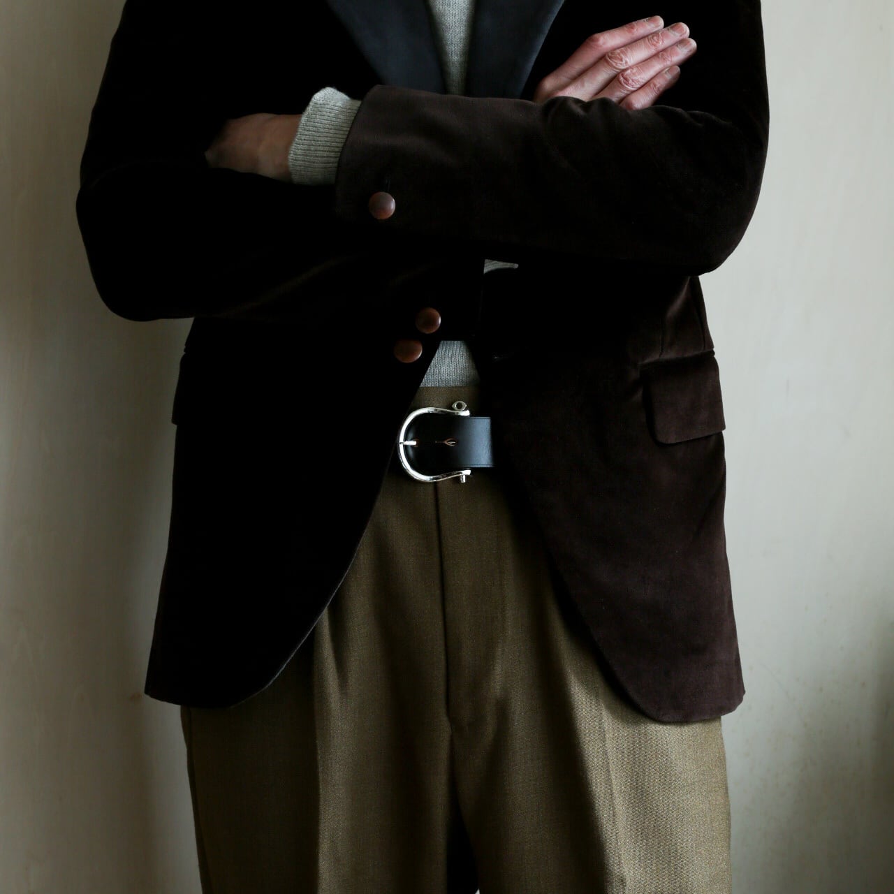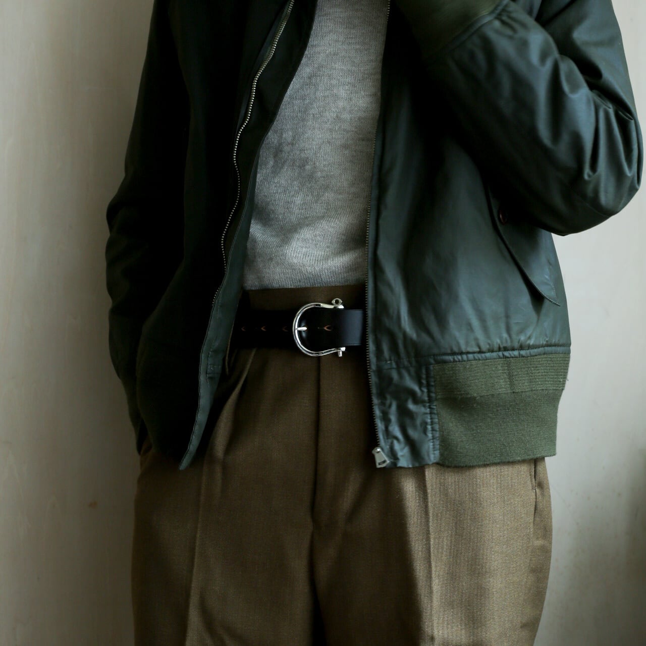 存在感のあるスターリングシルバー製のバックルと、英国ブライドルレザーのベルトは、デニムやウールなどのヘヴィーオンスパンツとの相性が抜群です。